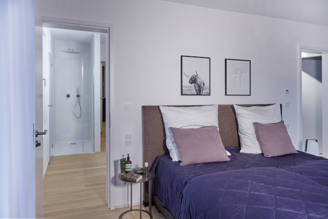 Das Interior Konzept der Häuser und Wohnungen des Quartiers führt in Materialien, Farben und Stimmungen die Architektur und umgebende Natur im Inneren fort. Natürliche, organische Materialien und zeitlos-funktionale Formen verleihen den Wohnräumen eine angenehme Leichtigkeit. Bodentiefe Verglasungen und große Fensterelemente fangen das Tageslicht ein. Die Wohnräume sind mit Echtholzparkett aus Eiche ausgestattet – ebenso die Bäder. Dort setzt LAGOM auf namhafte Marken wie KEUCO. Armaturen und Accessoires des Markenherstellers in brillant glänzenden Chromoberflächen ergänzen die eleganten, glasierten Fliesen und unterstreichen die helle Bad-Atmosphäre.