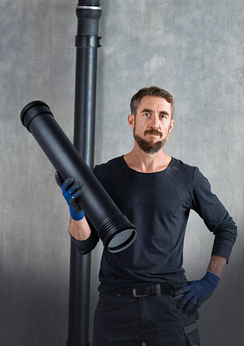 Geberit löst dieses Problem clever über ein Rohr mit zwei Muffen: Das Rohr mit den zwei Muffenenden kann passgenau durchtrennt werden und beide Teile finden weiter Verwendung. Das Ergebnis: geringere Materialkosten und kaum Rohrabfall dank weniger Verschnitt – ein wichtiger Beitrag zu nachhaltigerem Bauen. Hinzu kommt, dass für den SHK-Unternehmer die Lagerhaltung verschlankt wird und die Installateure dank weniger Rohren auch weniger Zeit für die Vorbereitung brauchen. Philipp Claus ist überzeugt: „Das Geberit Doppelmuffenrohr ist ein Gewinn für die SHK-Betriebe, die Mitarbeiter, die Kunden und die Umwelt gleichermaßen.“