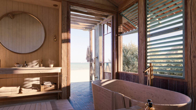 Poniatowskis Badkonzept löst die Grenze zwischen dem Innenraum und den Naturelementen auf. Natürliche Materialien wie rohes Kiefernholz und Travertin prägen das Interior, gestreift vom Sonnenlicht, das durch Faltfenster mit Holzlamellen fällt. Türkisfarbene Fliesen bedecken den Dusch- und Badebereich, der durch eine mit Teakholz umrahmte Tür auf eine schattige, mit freiliegenden Kiefernbalken strukturierte Terrasse führt. Der Duschbereich im Freien ist eine nahtlose Fortsetzung der Innenraumgestaltung, und der Effekt wird durch die AXOR Starck Nature Shower noch verstärkt: ein ikonisches Designobjekt, das die schlichte Eleganz und Schönheit von AXOR Starck unterstreicht.