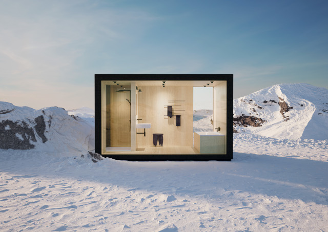 Badezimmer in Holzbauweise sind aktuell sehr gefragt. Die Delbrücker Badmarke Bette visualisiert diesen Trend jetzt mit einem Bad-Pavillon im Stil eines japanischen Tiny Houses, der wie ein achtsamer Rückzugsort inmitten der schneebedeckten Berglandschaft rund um die Naturregion Tokyos wirkt.