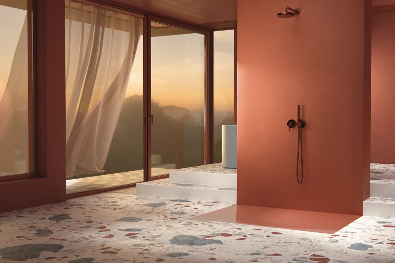 Dafür hat das Unternehmen auch den Ablauf neu gedacht und ihn auf 200 Millimeter vergrößert. Von außen sichtbar ist lediglich ein kreisrunder, drei Millimeter feiner Spalt inmitten der brillanten Oberfläche, durch den das Wasser abfließt. Die Ablaufleistung mit 0,6 l/s ist dabei selbst für opulente Regenduschen mehr als ausreichend. Der glasierte Ablaufdeckel ist absolut plan, sodass kein Unterschied zur umliegenden Fläche zu spüren oder zu sehen ist. Für die Reinigung kann er einfach abgenommen und wieder aufgesetzt werden. Viel zu reinigen gibt es jedoch nicht, denn darunter befindet sich eine selbstreinigende Ablaufgarnitur, bei der sich keine Haare im Ablauf oder im dahinter liegenden Rohrsegment verfangen können.
