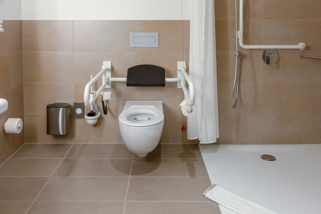 Entsprechend behindertenfreundlich beziehungsweise barrierefrei sind auch die Bäder der Hotelzimmer gestaltet. Die TGA-Planung stammt vom Stuttgarter Planungsbüro Deyle, das als Spezialist für Anlagen im internationalen Spitzensport den kompletten Bundesstützpunkt als Generalplaner geplant hat. Damit sich alle paralympischen Sportlern willkommen fühlen, sind die Bäder universell auf zahlreiche Einschränkungen vorbereitet, seien sie sensorischer, motorischer oder körperlicher Natur. Die Badräume sind großzügig gehalten, sodass genug Bewegungsspielraum vorhanden ist, zudem wurde eine helle, aber kontrastreiche weiße und beige Farbgebung gewählt, damit die unterschiedlichen Funktionsbereiche und Badelemente auch bei Sehschwächen gut erkennbar sind.