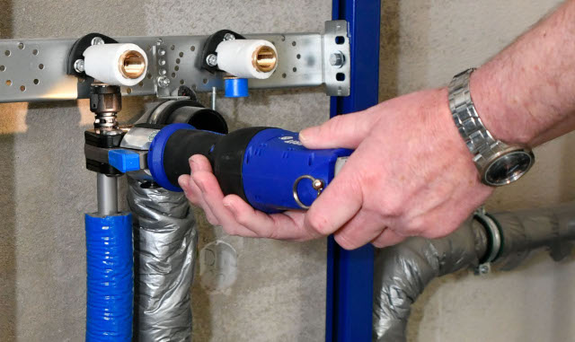 Auch bei der Trinkwasser-Installation schlugen Bauherr und Installateur neue Wege ein und wählten das innovative Versorgungssystem Geberit FlowFit. Mit seiner lateralen Verpressung sorgt es für einen besonders sicheren und einfachen Workflow: Die Pressstelle kann in jede gewünschte Position gedreht werden – so ist der Pressvorgang auch an engen Stellen problemlos möglich. Außerdem greift die Pressbacke nicht mehr das gesamte Fitting, sondern lediglich um den Pressindikator. Die Pressstelle, die das Fitting umfasst, wird dann zusammengezogen und die Verbindung dauerhaft dicht. Auch Installateur Schrenker ist überzeugt: „FlowFit ist ein sehr komfortables Presssystem. Für die Rohrdimensionen DN 12 bis DN 32 benötigten wir nur eine einzige Pressbacke. Der Werkzeugwechsel fiel also weg – ein echter Zeitgewinn. Auch das Entgraten und Kalibrieren ist bei diesem Versorgungssystem nicht mehr nötig.“ Er ergänzt: „Alle Fittings und Rohrleitungen sind mit Abdeckstopfen versehen, so dass vor dem Einbau kein Schmutz oder Staub in das Trinkwassersystem gelangen kann. Das ist ein wichtiger Vorteil für die Trinkwasserhygiene von Beginn an!“