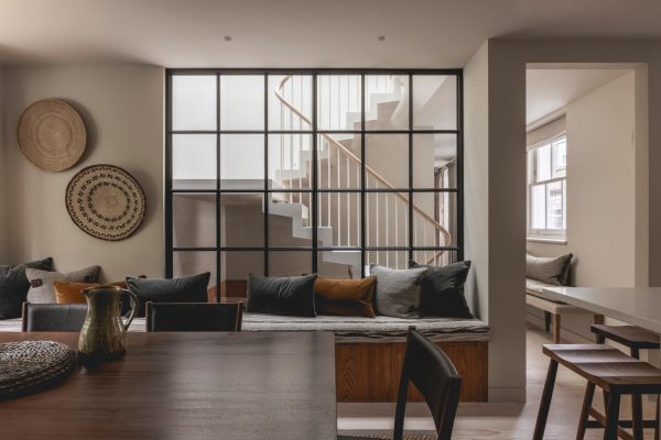 Eine zentral geführte Treppe zieht sich wie eine warme Achse durch alle Etagen und verbindet die Räume zu einer offenen, fließenden Einheit. Breite Dielen aus hellem Douglasienholz, maßgefertigte Einbauten und skandinavisches Mobiliar verleihen den Räumen eine ausgewogene Wirkung. Gemeinsam mit den Bauherren, einem dänisch-britischen Paar, entwickelte Neil Dusheiko Architects jedes Detail – von den Möbeln bis zu den Oberflächen. So verbindet der Entwurf nordische Schlichtheit mit britischer Handwerkstradition.