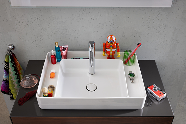 Wer in seinem Badezimmer besonderen Wert auf Ordnung und klare Strukturen legt, für den eignen sich die Aufsatzwaschbecken der Serie Bento Starck Box. Die intelligente Trennung von Nass- und Trockenbereichen ermöglichen die individuelle Gestaltung, wo persönliche Pflegeprodukte in Griffnähe platziert – und inszeniert – werden können. Gleichzeitig bleibt auf diese Weise die Ablagefläche rund ums Waschbecken gut geschützt vor Wasserspritzern.