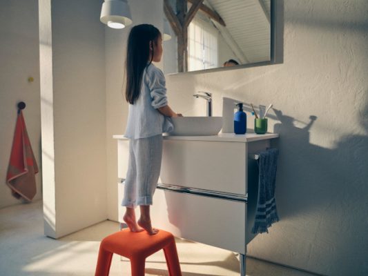 Um das heimische Bad im hektischen Alltag für Kinder sicher zu gestalten, empfiehlt sich der Einsatz von Thermostaten mit HeatLock-Funktion. So können sie selbstständig die Armatur bedienen, denn ihre empfindliche Haut wird durch eine Sicherheitssperre bei 38 °C vor Verbrühungen geschützt. Darüber hinaus vermitteln die Funktionen MinusFlow und FreshStart der Duravit-Armaturen schon den Kleinsten den ressourcenschonenden Umgang mit Wasser im Bad. Rutschhemmende Fliesen und Duschwannen sorgen zudem für mehr Trittsicherheit auf nassem Untergrund. Die recyclingfähige Duschwanne Sustano von Duravit zeichnet sich in den matten Ausführungen durch die Rutschfestigkeitsklasse C aus und kann bodengleich eingebaut werden, sodass keine Stolperfallen entstehen.