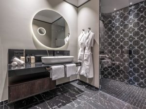 Bachhuber Contract, unter Leitung von Karin Huber, gestaltete die Innenräume und führte historische Bausubstanz mit modernen Ergänzungen zusammen. Edles dunkles Holz kontrastiert mit hellen Stoffen und poliertem Naturstein. Warme Lichtstimmungen, taktile Wandoberflächen und filigrane Metalldetails erzeugen eine Atmosphäre zwischen Grandezza und zeitgenössischem Komfort. In den Bädern der 126 Zimmer und Suiten setzen die Luv Aufsatzbecken von Duravit klare, puristische Akzente. Die ruhige Formsprache schafft Balance zu polierten Natursteinoberflächen und kunstvoll mit Mosaik gestalteten Duschnischen.