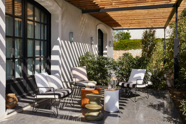 Die Neuinterpretation des Weinguts verbindet beruhigende mediterrane Töne mit modernen Materialen wie Beton sowie edlen Elementen wie Eiche, Marmor, Messing oder Leder. Alles fügt sich harmonisch zusammen und hat doch einen einzigartigen Charakter, der die eindeutige Handschrift von Humbert & Poyet trägt.