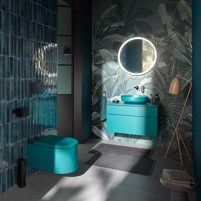Moderne Tapeten mit grafischen oder botanischen Mustern sind wie Kunstwerke – sie verleihen Räumen eine ganz besondere Ausstrahlung. Mit bunten, außergewöhnlichen Drucken initiierte Graham & Brown in den vergangenen Jahren die Renaissance der Tapete. Der renommierte, englische Hersteller hochwertiger Farbprodukte und Wandbeläge arbeitet mit unterschiedlichen Motiven aus der Natur, grafischen Mustern, Strukturen sowie luxuriösen Goldakzenten und setzt damit Trends. Im meist kleinen Badezimmer schafft eine mit Tapete gestaltete Akzentwand den stilistischen Rahmen für den gesamten Raum. Kombiniert mit neutralen oder komplementären Farben an den übrigen Wänden, entsteht eine ideale Bühne für die Badobjekte der Serie Vitrium von Duravit, die sich formal zurücknehmen und durch ihre intensiv-matte Farbe beeindrucken.