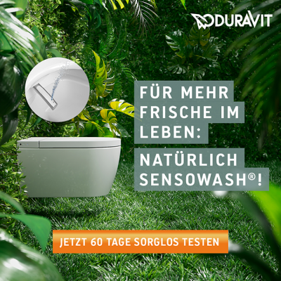 Wer den Komfort eines Dusch-WCs erst einmal testen konnte, wird diese angenehm erfrischende Art der Reinigung nicht mehr missen möchten. Die „60-Tage-Sorglos-Testen Aktion“ bietet eine attraktive Möglichkeit, Endkunden vom Kauf einen SensoWash® Dusch-WCs zu überzeugen. Nach Kauf und Einbau startet für den Endkunden der 60-tägige Testzeitraum. Danach kann es auf Wunsch das zurückgegeben und gegen ein herkömmliches Duravit-WC getauscht werden.