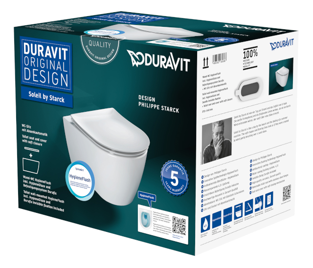 WC und WC-Sitz sind optisch und funktional perfekt aufeinander abgestimmt. Um die Lagerhaltung für Großhandel und Installateur zu vereinfachen und Bestellfehler zu vermeiden, bietet Duravit die Soleil by Starck HygieneFlush-WCs fertig im Set an – mit jeweils nur einer Bestellnummer: Im Karton enthalten ist ein WC und der passende Original WC-Sitz mit Absenkautomatik. Beim seitlich geschlossenen Modell außerdem die unsichtbare Durafix-Befestigung.