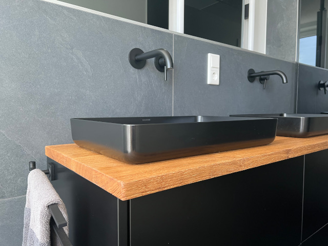 Für das neue Natur-Bad der Familie hat die Bloggerin die MIENA Waschtisch-Schale und eine CONODUO Badewanne mit SKIN TOUCH System ausgewählt. Das Style-Bad ist moderner in dunkleren Farben gehalten. Verbaut sind hier zwei schwarzmatte MIENA Waschtisch-Schalen sowie eine ebenfalls schwarzmatte CONOFLAT Duschfläche. Im harmonisch gestalten Gästebad des Hauses setzt eine MING Waschtisch-Schale ein echtes Ausrufezeichen in Sachen Stil, Design und Nachhaltigkeit.