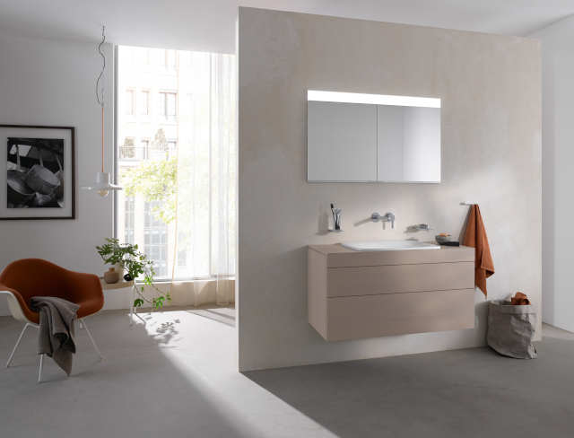 Beim Spiegelschrank ROYAL LUMOS von KEUCO beispielsweise hat man in Sachen Beleuchtung zwischen drei Modi die Qual der Wahl: Der umlaufende Rahmen bildet die Hauptbeleuchtung. Die Beleuchtung des Fachs rückt Lieblingsprodukte ins rechte Licht und die Waschtischbeleuchtung lässt die Armatur zum Star am Waschplatz werden. Die angenehm indirekte Waschtischbeleuchtung, die als Highlight das Licht nur auf die Armatur setzt, bietet sich auch als nächtliches Orientierungslicht an oder für ein entspanntes Wannenbad. Für die Raumbeleuchtung können auch beide Beleuchtungs-Modi gleichzeitig eingeschaltet werden.
