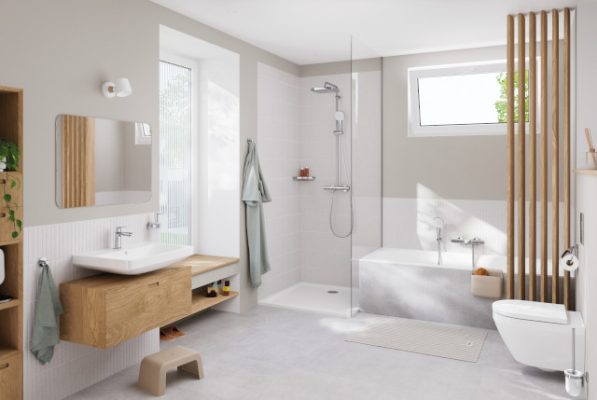 In Kombination mit einem GROHE Grohtherm 1000 Thermostat können Bewohner:innen Temperatur und Wassermenge zudem intuitiv einstellen. Die integrierte GROHE SafetyStop Technologie verhindert Verbrühungen, denn bei 38 Grad Celsius tritt eine Sicherheitssperre ein. Gerade in Familienbädern, in denen sowohl Senior:innen mit langsameren Reflexen als auch Kinder duschen, ein unverzichtbares Feature. Bei Bedarf können höhere Temperaturen durch Drücken der Taste eingestellt werden. Über eine ähnliche Funktionsweise verfügt der GROHE EcoButton, der den vollen Wasserdurchfluss zudem nur bei Betätigung zulässt. Das CoolTouch Design sorgt mit einem inneren Kühlkanal dafür, dass der gesamte Thermostatkörper nicht zu heiß zum Anfassen wird und sich die Kleinen – und Großen – nicht verbrennen.