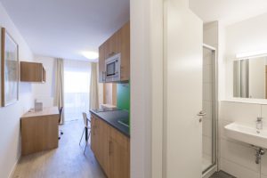 Damit die Bewohner für ihren befristeten Frankfurt-Aufenthalt nicht alles neu anschaffen müssen, sind die Apartments möbliert. „Verschiedene Dienstleister stellen auf Wunsch zusätzliche Dinge zu Verfügung – zum Beispiel Handtücher oder Bettwäsche. Ein Putzdienst ist ebenfalls buchbar“, erklärt Stefan Müller. Bequem per App können sich die Bewohner eine der Waschmaschinen im Haus reservieren. In der Tiefgarage parken Fahrzeuge eines Carsharing-Anbieters, auf die die Bewohner bei Bedarf ebenfalls zugreifen können.