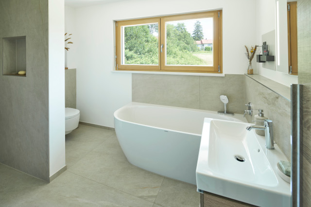 Das acht Quadratmeter große Bad ist perfekt auf die Bedürfnisse der Familie zugeschnitten. Es bietet viel Stauraum und Komfort für alle großen und kleinen Nutzer und fügt sich auch optisch elegant in die Umgebung des Hauses ein. Ein breites Fenster im Bad eröffnet den Blick in die Natur. Darunter findet eine Eckbadewanne Platz. Die linke Badseite teilen sich – durch einen Wandvorsprung getrennt – die bodenebene Dusche mit der Duschrinne CleanLine 80 und das Dusch-WC AquaClean Mera Comfort. An der Wand auf der rechten Seite lädt der komfortable Waschplatz zum Verweilen ein. Der Waschtisch sollte eine moderne, schlichte Form haben, ausreichend groß und leicht zu reinigen sein. Die Badmöbel und die Waschtischkeramik aus der Badserie Geberit iCon waren dafür ideal geeignet.