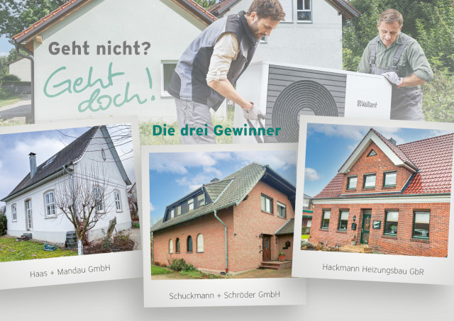 Die drei SHK-Fachhandwerksbetriebe Haas + Mandau, Schuckmann + Schröder und Hackmann Heizungsbau sind die Gewinner der „Geht nicht? Geht doch!“-Challenge von Vaillant. Insgesamt haben sich knapp 70 Firmen seit September 2021 mit ihren Sanierungsprojekten beworben. Im Fokus standen Ein- und Mehrfamilienhäuser, in denen die Wärmepumpeninstallation eine besondere Herausforderung darstellt. Eine Fachjury aus acht SHK-Experten unterzog die Modernisierungsprojekte einer intensiven Prüfung. Das Objekt von Haas + Mandau beweist, dass sich sogar denkmalgeschützte Gebäude für die Sanierung mit Wärmepumpen eignen. Schuckmann + Schröder setzte sich mit einem 90er-Jahre-Haus durch, in dem ein monoenergetisches Gesamtkonzept inklusive Stromerzeugung mit einer PV-Anlage umgesetzt werden soll. Der weitere Gewinner ist Hackmann Heizungsbau mit einem Altbau aus den 1950er-Jahren. Als idealtypisches Sanierungsprojekt eignet sich das Vorhaben, um Fachkollegen mit ähnlichen Sanierungsfällen vom Wärmepumpeneinsatz zu überzeugen. Gemeinsam mit dem Fachhandwerk will Vaillant im Rahmen der Challenge aufzeigen, dass sich Wärmepumpen in den unterschiedlichsten Fällen auch für die Gebäudesanierung eignen.