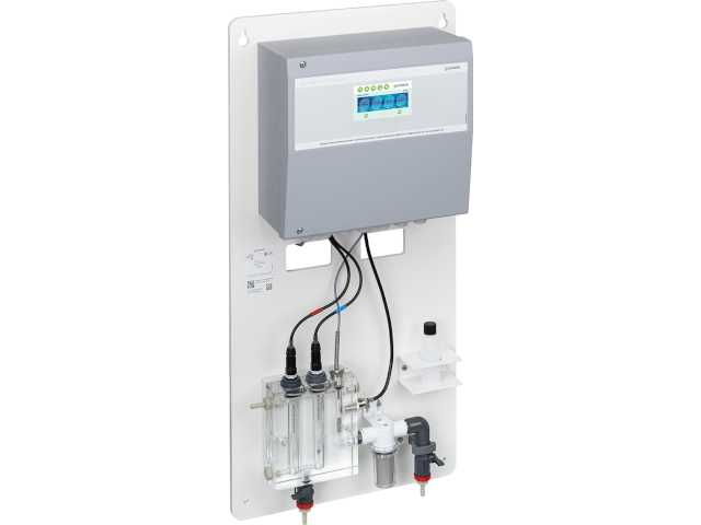 Die Nutzerfreundlichkeit beginnt bereits bei der Montage. Alle Elemente sind auf einer Wandhalterung vormoniert, sodass nur diese komplette Platte an der Wand befestigt werden muss. Eine komfortable Flaschenhalterung und leicht zugängliche Messelektroden vereinfachen zudem die Reinigung und softwaregeführte Kalibrierung.