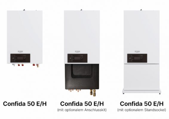 Die Confida 50 gibt es als monoenergetische Variante (Confida 50 E) oder als vorgefertigtes System für den hybriden Betrieb (Confida 50 H). Optional steht ein Anschluss-Kit zur Verfügung, in dem 3-Wege-Ventil sowie Absperrungen und Manometer schon integriert sind. Zudem bietet Remeha ab November neues Aufstellzubehör für die Wärmepumpen-Außeneinheit Confida MB 400 sowie neue Größen des Pufferspeichers Centra an. Weitere