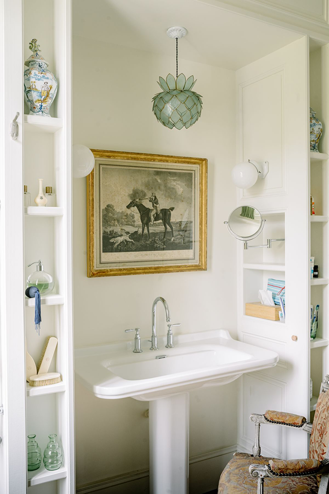 Behutsam und doch selbstbewusst, mit dem richtigen Gespür für Erhaltenswertes und zu Erneuerndem, hat Tristan Auer jeden einzelnen Raum in eine fast schon museumshafte Sammlung verwandelt: Im Esszimmer prägt ein prächtiger Holztisch mit Säulenfüßen die Szenerie, umrahmt von Einbauschränken und Holzvertäfelungen in zartem Grün sowie altem Porzellan aus dem hauseigenen Fundus. Wie in einem Bilderbuch wird im Wohnzimmer eine weitere Seite aufgeschlagen, die erneut zum Entdecken von kleinen Schätzen und großer Kreativität einlädt – darunter ein modernes Sofa und Sessel von Lignet Roset, ein chinesischer Couchtisch und ein von Tristan Auer selbst gestalteter Teppich neben Fischmotiven und Gemälden aus dem frühen 20. Jahrhundert. In der Küche treffen ein gusseiserner Herd unter dem historischen Kamin auf Zementfliesen und handbemalte Kacheln, die den rustikalen Look des Raums bis ins kleinste Detail fortführen. Sein Faible für poppige Farben und außergewöhnliche Materialien zeigt sich in der Gestaltung der Schlafzimmer, die entweder von maßgefertigten Fliesen in kräftigem Terrakotta oder von einer türkisgrüner Millefleurs-Tapete und einem imposanten Kopfteil des Betts im gleichen Farbton geprägt sind.
