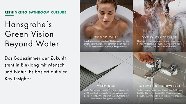 „Mit Hansgrohe’s Green Vision beenden wir das Zeitalter des ich-zentrierten Warmwasserkonsums im Badezimmer zur reinen Befriedigung von Reinigungs- und Wellnessbedürfnissen. Ein Badezimmer, das 90 Prozent weniger Wasser und Energie verbraucht als heutige Bäder und damit 90 Prozent CO2 einspart, ist unsere konsequente Antwort auf bevorstehende Wasser- und Energiekrisen“, sagt Steffen Erath, Head of Innovation & Sustainability der Hansgrohe SE.