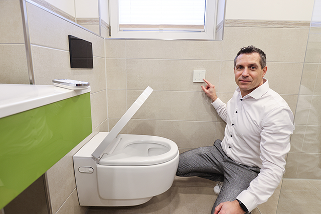 Die Voreinstellungen wie unter anderem die WC-Sitzheizung, die Geruchsabsaugung oder die Reichweite des Näherungssensors legt Nadim Sabeh per Fernbedienung fest. Diese wird allerdings nicht im Zimmer bleiben. „Der Gast braucht sie nicht wirklich und so kann sie auch nicht verloren gehen“, erklärt er. Stattdessen steuert der Gast die Toilette bequem per Wandbedienpanel.