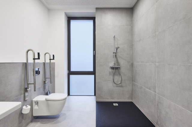 Der Stil dieser modernen Verwaltungsorganisation mit ausgeprägter Unternehmenskultur findet in insgesamt sechs Sanitärbereichen auf zwei Etagen seine Entsprechung: „Verschiedene Lösungen von Ideal Standard, die besonders auf die Bedürfnisse der Mieter abgestimmt sind, setzen wir bereits im Rahmen unserer Neubau- und Modernisierungsprojekte ein. Das Verwaltungsgebäude stellte jedoch andere Anforderungen, und so wollten wir hier andere Wege gehen. Dabei sollte die Ausstattung analog zum architektonischen Konzept das Historische untermalen. Aber auch im Miteinander der modernen Büroumgebung sollte sie in sich stimmig sein“, kommentiert Marie Kürwers. So entstand schließlich das nachfolgend beschriebene Ausstattungskonzept im Erdgeschoss für einen behindertengerechten Sanitärbereich mit Dusche sowie zwei Besucher-WCs und im Obergeschoss für zwei weitere Mitarbeiter-WCs. Wesentliche Elemente der behindertengerechten Toilette sind der unterfahrbare Waschtisch Connect Freedom sowie Wandspiegel und Wand-WC aus der Serie Connect. Mitarbeiter wünschten sich hier auch eine Dusche. Hier wurde das Duschwannensystem Ultra Flat S mit Brausekombination Ceratherm T100 eingesetzt. Während das behindertengerechte WC für Damen und Herren gefliest ist, wurde in den anderen Sanitärbereichen ein dunkler, halb die Wand hochgezogener Vinyl-Boden verwendet. Er mutet wie ein Industrieestrich an. Hiervon setzt sich die weiße Keramik sehr gut ab und harmoniert mit dem historischen Stil des Gebäudes. Das gilt auch für Besucher- sowie Mitarbeiter-WCs des Erd- und Obergeschosses. Hier wählte das Planungsteam Conca-Waschtische. Conca gehört zu den Atelier Collections von Ideal Standard. Im Zuge eines aufeinander abgestimmten Gesamtbildes wurden die Conca-Waschtische mit Blend-Square-Wand-WCs mit AquaBlade-Spültechnologie sowie mit Accessoires aus der Serie Connect vervollständigt.
