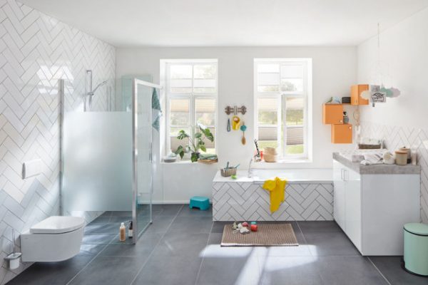 und sorgt für mehr Intimsphäre. Damit es keine Stolperfallen im Badezimmer gibt, wurde auch der Duschplatz bodeneben mit dem Kermi Duschboard LINE mittig gestaltet. Das Board und die Rinnenabdeckung wurden mit den Bodenfliesen des Badezimmers belegt. Dadurch fügt sich der Duschbereich nahtlos in das Familienbad ein. Dem Familiengetümmel sind keine Grenzen gesetzt.