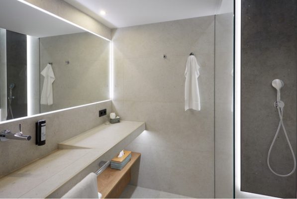 In den barrierefreien Bädern, die erst auf den zweiten Blick als solche zu erkennen sind, profitieren die Gäste von IXMO Armaturen in Kombination mit dem PLAN CARE Relingsystem in der Dusche, das unterstützende Sicherheit und Komfort bietet. Am Waschtisch kann der iLook_move dank des flexiblen Scharniers auch im Sitzen genutzt werden. Die IXMO Sensorarmatur wird berührungslos aktiviert. Öffnet man den Unterschrank, können die Gäste auch bequem vor dem KEUCO Waschtisch sitzen oder ihn bequem mit dem Rollstuhl unterfahren.