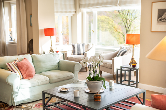 „Das Zuhause ist für mich der wichtigste Ort“, sagt Maria von Boch, „hier soll sich die ganze Familie wohlfühlen.“ Daher gestaltet sie ihr Zuhause mit vielen liebevollen Details und sorgt regelmäßig für frische Blumen. Arrangiert in hübschen Vasen oder einer alten Art déco-Schale vom Flohmarkt – natürlich von Villeroy & Boch – schenken sie dem Wohn- und Essbereich farbenfrohe Akzente und verbreiten einen zarten Duft. Die Wände sind in einem warmen Beige gestrichen, helle Polster und massive Holzmöbel geben den Räumen eine entspannte Behaglichkeit. Im ganzen Haus zu finden: Die Produkte des Familienunternehmens. Die Bäder sind mit der erfolgreichen Kollektion Subway ausgestattet, auch die keramische Küchenspüle stammt von Villeroy & Boch.