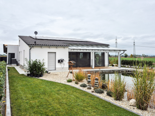 Der Bungalow in Tabertshausen mit einer Grundfläche von rund 100 m² bietet neben dem Wohnbereich für zwei Personen unter dem Dach auch Platz für ein kleines Büro. Um sich für die Zukunft aufzustellen, wünschte sich der Bauherr eine umweltfreundliche und von fossilen Brennstoffen unabhängige Wärmeversorgung. Dafür kamen Wärmepumpe und -speicher sowie Flächenheizung/-kühlung von KERMI zum Einsatz. Zusätzlich wurde in dem Neubau (KfW-Effizienzhaus 40) eine zentrale Wohnraumlüftung installiert – für ein optimales Raumklima aus einer Hand.
