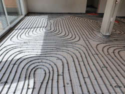 Um eine effiziente Wärmeverteilung und optimale Behaglichkeit zu erreichen, entschied sich der Bauherr für eine Flächenheizung/-kühlung. Zum Einsatz kam das x-net C12 Tackersystem, das mit großformatigen Tackerrollen eine einfache Verlegung der Dämmschicht ermöglichte. Durch den seitlichen Folienüberstand und die integrierten Selbstklebestreifen konnte der Installateur die Platten zügig und fließestrichdicht verbinden. Mithilfe der einzigartigen x-netAbrollvorrichtung konnten die Heizrohre drallfrei aus der Verpackung abgerollt und mit dem x-net Tackergerät sicher fixiert werden. Die hochreißfeste Ankergewebefolie sorgt für hohe Trittfestigkeit und einen zuverlässigen Halt der x-net Rohranker. Im oberen Bereich des Bungalows wurde eine Wandheizung/-kühlung installiert. Zum Einsatz kam das x-net C21 Putzsystem, das dank geringer Rohrüberdeckung reaktionsschnell arbeitet.