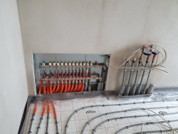 Für eine effiziente Wärmeverteilung und optimalen Komfort entschied sich der Bauherr für eine Flächenheizung/-kühlung. Zum Einsatz kam das x-net C12 Tackersystem, welches eine sichere Fixierung der Heizungsrohre ermöglicht (Bild links). Mit dem x-net Tackergerät konnte die Verarbeitung schnell und einfach durchgeführt werden. Der xnet Verteilerschrank ermöglicht eine praxisgerechte Rohrführung nach vorne und auch nach hinten durch die Wand (Bild rechts).
