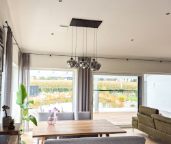 Zusätzlich wurde der Bungalow mit einem zentralen Wohnraumlüftungssystem ausgestattet. Dieses sorgt mit dem x-well S280 für einen kontinuierlichen Luftaustausch in allen Räumen und somit für frische Luft sowie ausgezeichneten Wohnkomfort. Das Gerät trägt durch einen hohen Wärmerückgewinnungsgrad von über 90 Prozent auch zur Effizienz des Gebäudes bei. Die Lüftungsrohre für diese Lösung wurden bereits im Rohbau verlegt. Das Lüftungsgerät selbst fand zusammen mit dem Wärmespeicher im Technikraum Platz. Im täglichen Betrieb punktet das Gerät mit der Energieeffizienzklasse A+ und einem niedrigen Schallleistungspegel von nur 43 dB(A). Eine zusätzliche Besonderheit: Die Regulierung der Volumenströme der einzelnen Räume erfolgt bei den zentralen x-well Systemen bereits im Verteilerkasten und nicht erst beim Luftdurchlass, wo eine Querschnittsverengung den entstehenden Schall direkt in den Raum abgeben würde. Für die Bewohner des Bungalows bedeutet das, dass der automatische Luftaustausch enorm leise stattfindet und somit dezent im Hintergrund bleibt.