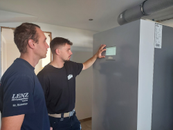 Die Auswahl und Installation der effizienten Einzelkomponenten – von der Wärmeerzeugung über die -verteilung bis zur Lüftung – ist der erste Schritt. Entscheidend ist aber vor allem auch die optimale Kombination und Regelung. Um eine einwandfreie Inbetriebnahme sicherzustellen, beauftragte der Fachhandwerksbetrieb die Unterstützung durch einen KERMI-Experten: Auf der Baustelle nahmen Philipp Blüml, Servicetechniker im Außendienst bei KERMI, und M. Sommer gemeinsam die Einstellungen bei Wärmepumpe und Wohnraumlüftung vor. „Für uns war das die ideale Gelegenheit, direkt und am konkreten Anwendungsbeispiel vom Herstellerwissen zu profitieren. So konnten wir die Besonderheiten der Produkte in der Praxis kennenlernen und uns spezifisches Know-how aneignen. Damit sind wir für die nächsten Inbetriebnahmen gerüstet“, berichtet S. Schmidt, Geschäftsführer der Lenz Heizungsbau GmbH.