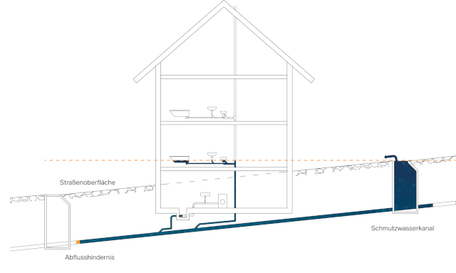 Die Definition der Rückstauebene nach DIN EN 12056-1 „Die höchste Ebene, bis zu der das Wasser in einer Entwässerungsanlage ansteigen kann“ wurde im Allgemeinen mit der Geländeoberkante am Anschlusspunkt der Gebäudeentwässerungsanlage (GEA) an den Straßenkanal gleichgesetzt. Diese Interpretation versagt jedoch bei Gebäuden in Hanglage oder beim Fehlen eines Übergabeschachts mit offenem Durchfluss auf dem Gebäudegrundstück. Das Beispiel in Abb. 1 zeigt, dass die Geländeoberkante am Anschlusspunkt der GEA nicht pauschal mit der Rückstauebene gleichgesetzt werden kann. Bei einem möglichen Abflusshindernis im Straßenkanal in Fließrichtung vor dem tieferliegenden Schacht liegt der wirksame Entspannungspunkt oberhalb des höhergelegenen Schachts.