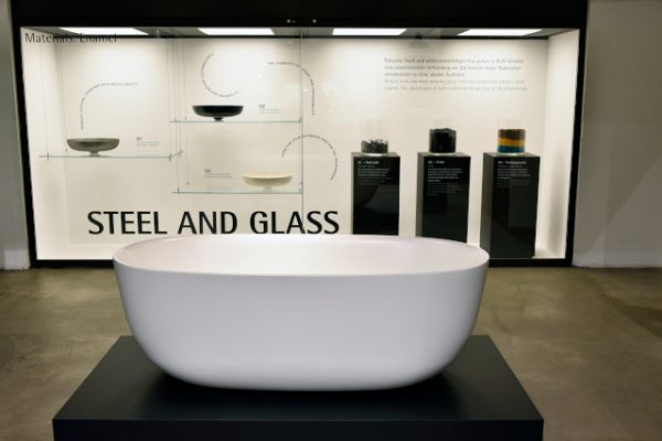Als Teil der „Design Fundamentals“ rückt Kaldewei auf über 4000 Quadratmetern Ausstellungsfläche die Nachhaltigkeit des Hightech-Materials Stahl-Emaille in den Fokus. Anhand mehrerer Stelen erfahren die Besucher viel über die besonderen Eigenschaften der Kaldewei Badlösungen sowie über das edle Material, das sich durch eine 100-prozentige Kreislauffähigkeit auszeichnet. Schließlich ist Kaldewei weltweit der einzige Badhersteller, der seine Emaille in der eigenen Schmelze nach geheimer Rezeptur selbst produziert und anschließend die Stahl-Rohlinge damit veredelt.