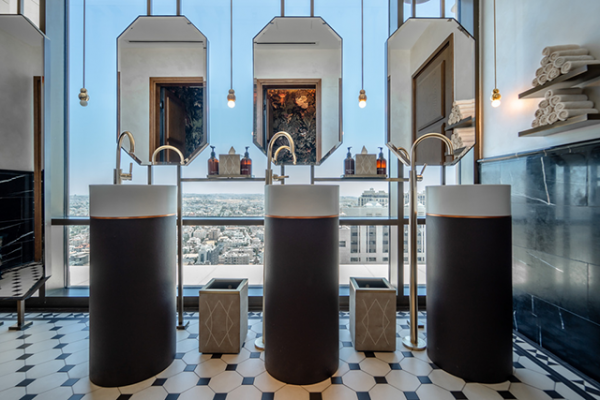 Während die Fassade des Hotels in einem klassischen, arabischen Stil gehalten ist, wird das Interior Design von Art-Déco-Elementen und moderner Kunst bestimmt. Die großzügigen, komfortabel eingerichteten Gästezimmer bieten mit raumhohen Fenstern Blick auf die Stadt. Mit eleganten Möbeln und Dekorationen aus hochwertigen Materialien ist das Interieur zeitlos und modern zugleich gehalten. Das noble Flair der Einrichtung wird bis in die luxuriösen Marmorbäder, die mit hochwertigen Badprodukten von Villeroy & Boch ausgestattet sind, fortgeführt. Dazu hat der Premiumhersteller komplette Gestaltungslösungen geliefert: Sanitärelemente aus verschiedenen Serien, Badewannen sowohl freistehend als auch eingebaut und dazu Armaturen für Waschtische, Duschen und Badewannen inklusive der passenden Accessoires. Absolute Highlights: Die imposanten Säulen-Waschtische Octagon, die mit einem spektakulären Design überraschen, das so nur dank des besonderen Werkstoffs TitanCeram möglich ist. Mit filigranen Facetten wird im Beckeninnern ein exaktes Achteck geformt, das Assoziationen zu geschliffenen Edelsteinen weckt. Vollkommen wird Octagon durch die Präsentation auf einer imposanten Säule aus edlem Leder, verbunden durch einen Zierring aus Kupfer, der als weiteres exquisites Design-Element des Eyecatchers glänzt.
