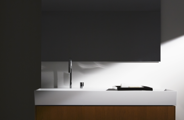 Das Herzstück der Solos-Kollektion ist eine Kombination aus Armatur und Waschtisch. Die Armatur ist vollständig in den Waschtisch integriert: Nur der schlanke Auslauf und der Bedienknopf sind sichtbar, während die dazugehörige Technik unter dem Becken verborgen ist. Seine geraden Linien und dünnen Kanten verleihen dem Waschtisch ein schwereloses Aussehen – Solos schafft somit ein rundum elegantes, minimalistisches Erscheinungsbild.