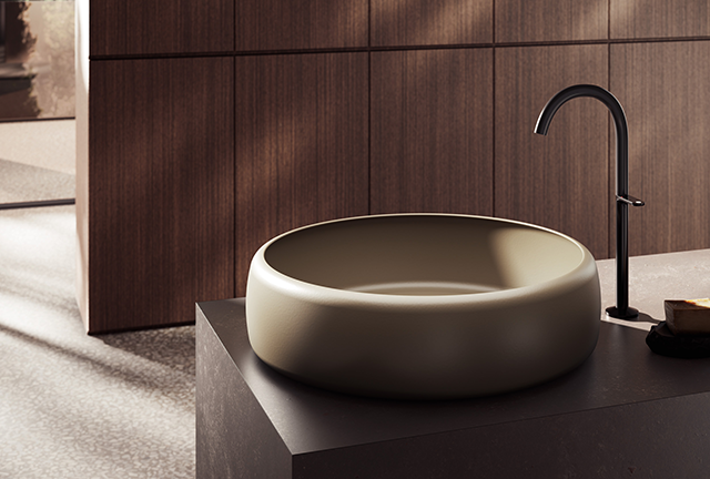 Die exakt planebenen Unterseiten der Schalen ermöglichen eine nahezu nahtlose Anbindung an den jeweiligen Untergrund – ganz gleich, ob es sich dabei um Holz, Naturstein, Beton oder eine andere glatte Oberfläche handelt. Serienmäßig sind die Schalenwaschtische zudem schalldämmend ausgestattet, ein wichtiges Kriterium in allen Umgebungen, in denen Geräuschquellen reduziert werden sollen, beispielsweise in Hotelbädern oder in privaten Badräumen mit angrenzendem Schlafbereich.