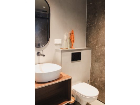 Das durchdachte Designkonzept setzt sich auch in der Kitchenette fort: Hier fügt sich die KEUCO EDITION 400 Armatur in Schwarzchrom nahtlos in das Design der anthrazitfarbenen Spüle ein.