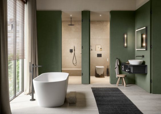 Ein Gefühl von Wärme, Geborgenheit und Intimität zu vermitteln, das war das Ziel von Bertrand Lejoly, als er sein Signature-Bathroom entwarf. „Ich wollte warme Materialien und Accessoires verwenden, um die sterile und kalte Atmosphäre zu vermeiden, die Bäder manchmal ausstrahlen“, erklärt der Designer. Und so folgte er dem Trend, das Bad als warmen Rückzugsraum zu gestalten, der eine offene Raumgestaltung mit intimen Elementen verbindet und dessen Materialien perfekt mit dem desaturierten Moosgrün als Wandfarbe harmonieren.
