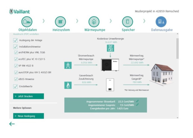 „Unser Ziel ist, auch weniger erfahrenen Fachhandwerkern die sichere und fehlerfreie Auslegung einer Wärmepumpenanlage zu ermöglichen“, beschreibt Gerrit Lau, Leiter Systemberatung bei Vaillant Deutschland. Für das Projekt haben wir die häufigsten Fehler bei der Planung und Installation von Wärmepumpenanlagen ermittelt und ausgewertet. Gemeinsam mit Fachhandwerkspartnern haben wir dann die Planung beziehungsweise Auslegung einer Wärmepumpenanlage vereinfacht und standardisiert. In aufeinander aufbauenden, selbsterklärenden Schritten führt die Software durch die Anlagenplanung und fragt die dafür relevanten Daten ab. So startet das Tool mit der Eingabe der Postleitzahl des Objektes, um im Hintergrund die Normaußentemperatur zu berechnen. Für die tatsächliche Heizlast des Gebäudes stehen zwei verschiedene Möglichkeiten zur Verfügung – entweder durch Angabe der Wohnfläche und einfacher Daten zur Art des Gebäudes oder durch Eingabe der Gas- oder Öl-Verbräuche der letzten drei Jahre. Wählt der Anwender eine Vorlauftemperatur von mehr als 55 °C, wird automatisch die Betriebsart „bivalent alternativ“ gewählt. Dieses Vorgehen vermeidet mögliche Ineffizienzen bereits bei der Auslegung der Anlage.