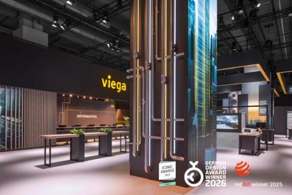 Der Viega Messestand auf der ISH 2025 wurde gleich dreifach ausgezeichnet: mit dem Red Dot Award 2025 in der Kategorie Brands & Communication Design, dem German Design Award 2026 in der Kategorie Excellent Architecture/Fair and Exhibition sowie dem Iconic Award 2025 in der Kategorie Architecture/Event and Exhibition. Die international renommierten Preise würdigen das Messekonzept, das durch eine klare architektonische Struktur und ein konsistentes Kommunikationsdesign die Marke Viega in Szene setzt.