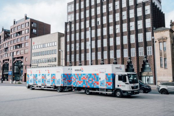Der Duschanhänger von MOBALNI ist etwa neun Meter lang, sodass drei Badezimmer mit je einer Dusche, WC und Waschbecken darin Platz finden. Eines der Bäder ist durch einen Lift zugänglich und komplett barrierefrei. Duschhandläufe und Klappgriffe, die ebenfalls von Villeroy & Boch beigesteuert wurden, erhöhen die Benutzerfreundlichkeit zusätzlich.