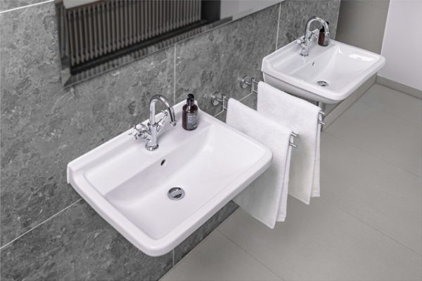 Die frisch sanierten Bäder schaffen den Spagat zwischen historischer Substanz und modernem Komfort. Grüne Fliesen aus der Uhrenfabrik Junghans verleihen den Bädern historischen Charme, graumarmorierte und sandgraue Fliesen setzen moderne Akzente. Die eleganten Waschtische und wandhängenden WCs der Serie Starck 3 unterstreichen das zeitlose Ambiente. Besonders gelungen ist die Verschmelzung von inklusivem Komfort und Design im Bad des barrierefreien Gästezimmers. Dafür sorgen der unterfahrbare Waschtisch Vital und das Wand-WC Vital aus der Serie Starck 3.